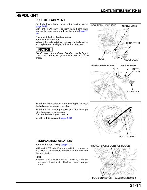 Complete workshop service manual with electrical wiring diagrams for 1975-2010 Honda GL500, GL1000, GL1200, GL1500, GL1800 Motorcycle. It's the same service manual used by dealers that guaranteed to be fully functional and intact without any missing page.